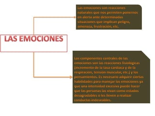 Este documento discute la emoción de la ira y proporciona sugerencias para manejarla. La ira se refiere a sentimientos como el enojo y la irritación que surgen cuando no se obtiene lo que se desea. Al igual que la ansiedad, la ira provoca reacciones fisiológicas, pero se diferencian en los tipos de situaciones y pensamientos que las causan. Los estados emocionales negativos como la ira y la ansiedad a menudo conducen a comportamientos inadecuados, por lo que el documento of