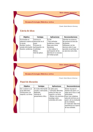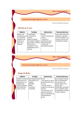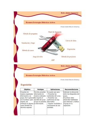 Las técnicas didácticas activas promueven la participación activa del estudiante en su proceso de aprendizaje a través de actividades grupales e individuales que fomentan el pensamiento crítico y la resolución de problemas. Estas técnicas incluyen el aprendizaje basado en proyectos, debates, role playing, estudio de casos y brainstorming para motivar a los estudiantes y hacer el aprendizaje más dinámico e interesante que con métodos tradicionales.