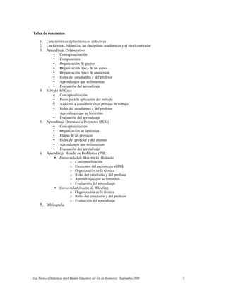 El documento detalla las técnicas didácticas utilizadas en el modelo educativo del Tecnológico de Monterrey, incluyendo aprendizaje colaborativo, método del caso, aprendizaje orientado a proyectos y aprendizaje basado en problemas. Estas técnicas fomentan un aprendizaje activo y reflexivo entre los estudiantes, integrando habilidades sociales y una relación más cercana con el contenido y el entorno. Se enfatiza que la adecuación de las técnicas se basa en el área disciplinar y el nivel académico de los estudiantes.