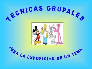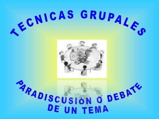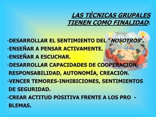 Las técnicas grupales tienen como objetivos desarrollar la cooperación, responsabilidad y autonomía de los miembros, así como crear una actitud positiva frente a los problemas. Existen diferentes técnicas como el simposio, la mesa redonda y el debate dirigido para exponer, discutir y profundizar temas de manera organizada. La elección de la técnica adecuada depende de factores como los objetivos del grupo y las características de sus miembros.