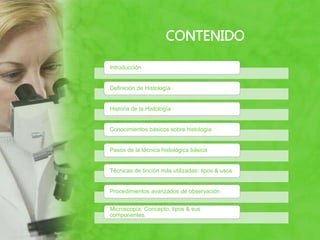 Este documento presenta una introducción a la técnica histológica y la microscopía. Define la histología y resume brevemente su historia. Explica conceptos básicos como los tejidos y los pasos de la técnica histológica. Describe varias técnicas de tinción comúnmente usadas y procedimientos avanzados como la histoquímica e inmunocitoquímica. Finalmente, define el microscopio y explica sus componentes y tipos principales.