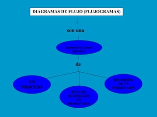 El documento describe los diagramas de flujo (flujogramas), que son representaciones gráficas de los pasos de un proceso. Explica la simbología utilizada por ASME para flujos de materiales y personas y por ANSI para flujos de información. También clasifica los flujogramas por propósito, nivel de detalle, forma y recomienda buenas prácticas para su elaboración.