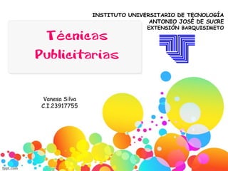 El documento habla sobre las técnicas publicitarias. Explica que la publicidad busca comunicar y motivar a los consumidores sobre los beneficios de los productos. Luego describe que las técnicas publicitarias usan ideas para influir dinámicamente en los espectadores llevándoles mensajes sobre las ventajas de los productos anunciados. Finalmente, menciona algunos tipos de usuarios y estratos económicos que pueden ser afectados por diferentes técnicas publicitarias.