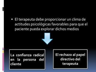 La terapia centrada en el cliente se basa en la hipótesis de que los individuos poseen los medios para la auto comprensión y el cambio. El terapeuta debe crear un clima de aceptación para que el paciente pueda explorar estos medios. Las actitudes fundamentales del terapeuta son la congruencia, la empatía y el respeto incondicional. Cuando el paciente se siente comprendido y aceptado, experimenta relajación de sentimientos, cambia su modo de experimentar y se vuelve más coherente.