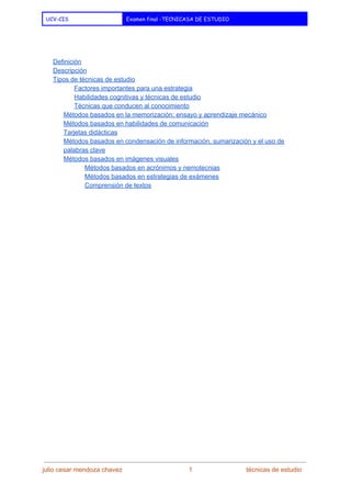 Las técnicas de estudio se definen como estrategias y procedimientos cognitivos y metacognitivos vinculados al aprendizaje. Existen varios tipos de técnicas, incluyendo métodos basados en la memorización, habilidades de comunicación, condensación de información, imágenes visuales, y estrategias para exámenes. Algunas técnicas específicas discutidas son el método PQRST, diagramas de araña, tarjetas didácticas y acrónimos/nemotecnias.