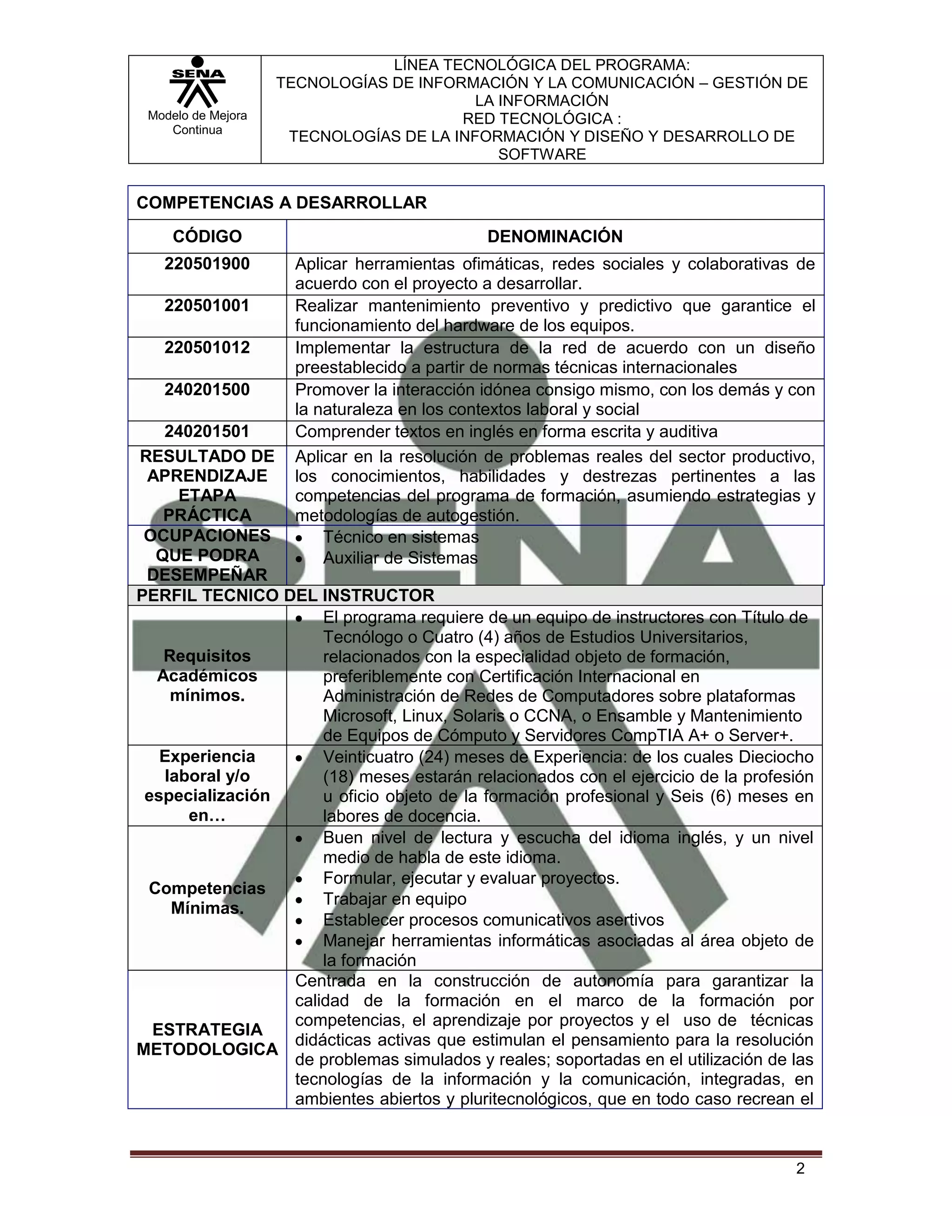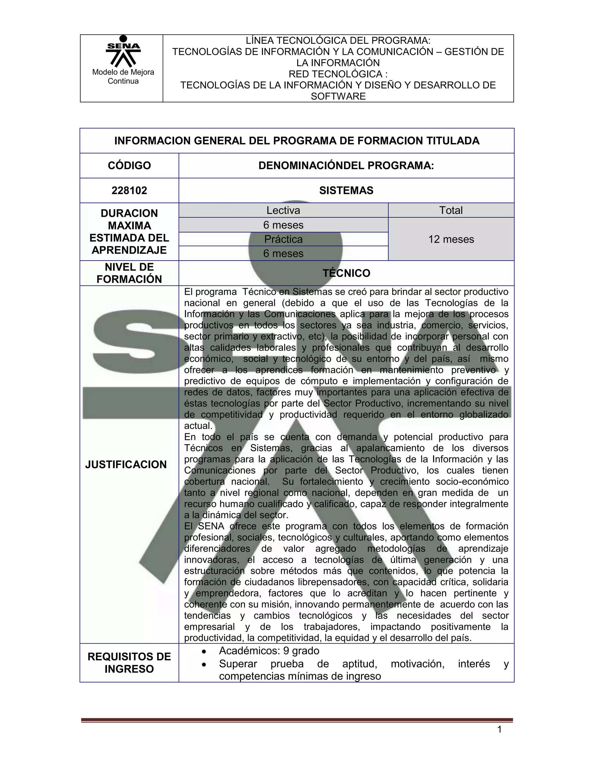 El documento describe un programa de formación técnica en sistemas que incluye: