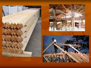 Este documento presenta información sobre la madera como material de construcción. En primer lugar, describe brevemente la composición, estructura y propiedades físicas de la madera. Luego, detalla la historia del uso de la madera en la construcción desde la antigüedad y sus principales características como material, incluyendo su anisotropía y contenido de humedad. Finalmente, resume las propiedades mecánicas de la madera como su resistencia, elasticidad, dureza y cortadura.