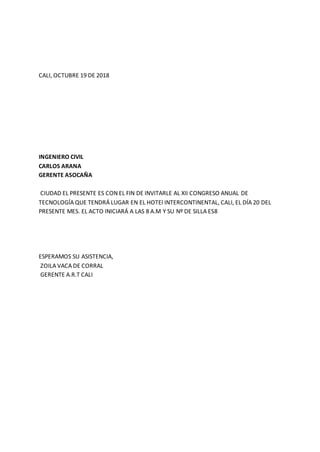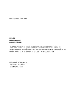 El documento contiene 15 invitaciones al XII Congreso Anual de Tecnología que se llevará a cabo el 20 de octubre en el Hotel Intercontinental de Cali. Cada invitación incluye el nombre y profesión de la persona invitada y el número de silla asignado.