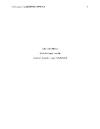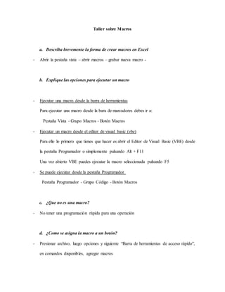 El documento describe las funciones de macros en Excel, incluyendo cómo crear, ejecutar y eliminar macros. También explica la relación entre macros y Visual Basic y define Visual Basic como un lenguaje de programación desarrollado por Microsoft para facilitar la creación de interfaces gráficas. Finalmente, describe funciones como SI, PROMEDIO, CONTAR SI, MÁXIMO y MÍNIMO que facilitan la programación y análisis de datos en Excel.