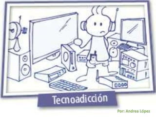 Este documento describe la tecnoadicción como una dependencia excesiva a la tecnología que limita la libertad humana. Los síntomas incluyen necesitar más tiempo de conexión, sentir malestar cuando no se está conectado, y descuidar actividades habituales. Se recomienda prevenir la tecnoadicción controlando el tiempo de navegación y respetando horarios para otras actividades.