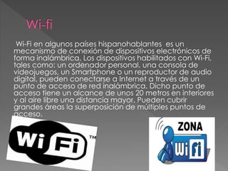 Wi-Fi permite que dispositivos electrónicos como ordenadores, consolas de videojuegos, teléfonos inteligentes y reproductores de audio se conecten a Internet de forma inalámbrica a través de un punto de acceso con un alcance de 20 metros en interiores y mayor al aire libre. Múltiples puntos de acceso pueden cubrir grandes áreas mediante la superposición de sus señales.