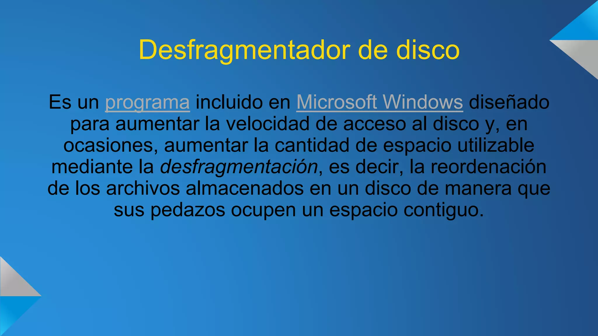Un desfragmentador de disco es un programa que reorganiza los archivos almacenados en un disco para que ocupen un espacio contiguo, lo que minimiza el tiempo de movimiento de los cabezales del disco y aumenta la velocidad de transferencia. Esto mejora el rendimiento general del sistema al hacer que los archivos sean más fáciles y rápidos de encontrar. La desfragmentación también puede liberar espacio adicional eliminando los espacios vacíos fragmentados en el disco.