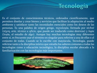 El documento habla sobre el concepto de tecnología. Define tecnología como el conjunto de conocimientos técnicos ordenados científicamente que permiten crear bienes y servicios para satisfacer las necesidades humanas y adaptarse al medio ambiente. Explica que la tecnología influye en el progreso social y económico aunque a veces se enfoca más en satisfacer deseos que necesidades. Finalmente, describe algunos métodos, herramientas e hitos importantes en el desarrollo de la tecnología a través de la historia.