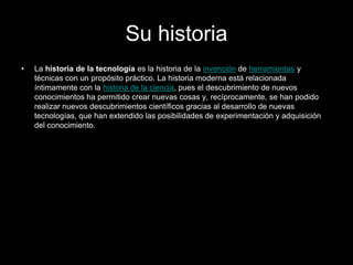 La tecnología es el conjunto de conocimientos técnicos ordenados científicamente que permiten diseñar y crear bienes y servicios para satisfacer las necesidades humanas y adaptarse al medio ambiente. La historia de la tecnología está íntimamente relacionada con la historia de la ciencia, ya que los nuevos descubrimientos científicos han permitido crear nuevas tecnologías, y viceversa.