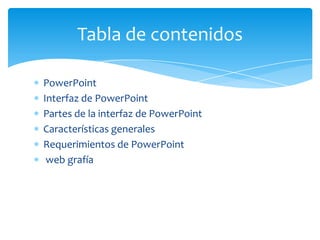 Este documento describe las características y requisitos de Microsoft PowerPoint. PowerPoint es un programa que permite crear presentaciones de forma fácil y rápida con herramientas para personalizar textos, gráficos e imágenes. La interfaz incluye barras de menús, objetos, títulos y estado. Se requiere un PC con Windows XP o superior, 128 MB de RAM y 150 MB de espacio en disco.