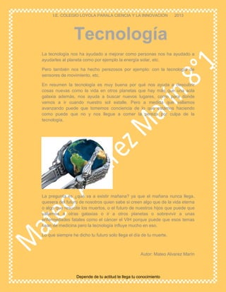 El documento discute los efectos positivos y negativos de la tecnología. Por un lado, la tecnología como la energía solar ha ayudado a mejorar la vida de las personas y proteger el planeta. Sin embargo, también ha hecho que las personas sean más perezosas debido a la automatización. El futuro del desarrollo tecnológico es incierto, pero podría conducir al descubrimiento de nuevos lugares en el espacio o soluciones médicas para enfermedades.