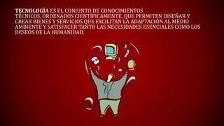 El documento define la tecnología como el conjunto de conocimientos técnicos ordenados científicamente que permiten diseñar bienes y servicios para satisfacer las necesidades humanas y adaptarse al medio ambiente. También distingue entre tecnología fija, que no cambia continuamente, tecnología flexible que permite elaborar otros productos, y tecnología limpia que no produce modificaciones en el ambiente.