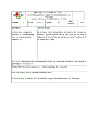 El resumen describe una clase en la Institución Educativa Colegio Loyola para la Ciencia y la Innovación. La profesora Luz Marina explicó el proyecto de finanzas que los estudiantes realizarían durante el año y les dio libros de "educación financiera" para que comenzaran con el primer módulo. No hubo evaluaciones ni planes de apoyo durante la clase.