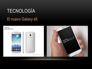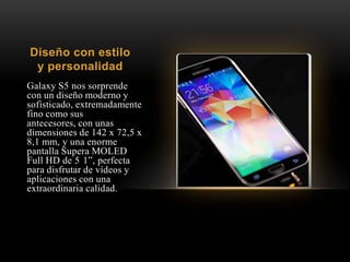 El documento describe las características del nuevo Samsung Galaxy S5, incluyendo su diseño delgado y pantalla grande, cámara de alta resolución y rápida, capacidades de monitoreo de salud y forma física junto con el reloj Gear Fit, y su capacidad de mantener conexiones WiFi y 4G de alta velocidad al mismo tiempo.