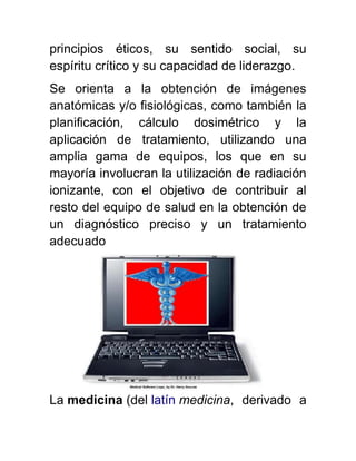 El documento describe el rol del tecnólogo médico. El tecnólogo médico utiliza equipos médicos como rayos X y ultrasonido para obtener imágenes anatómicas y fisiológicas que ayudan a otros profesionales médicos a diagnosticar problemas de salud y planificar tratamientos. El tecnólogo médico se enfoca en el apoyo al diagnóstico y tratamiento médico a través del uso de tecnología, sin involucrarse directamente en el tratamiento de pacientes.
