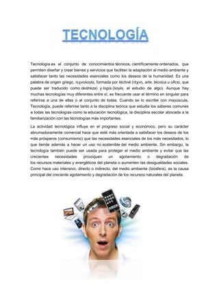 La tecnología se refiere al conjunto de conocimientos técnicos y científicos que permiten crear bienes y servicios para satisfacer las necesidades humanas y adaptarse al medio ambiente. Aunque influye en el progreso social y económico, su enfoque comercial hace que esté más orientada a satisfacer los deseos de los más prósperos que las necesidades de los más necesitados, aunque también puede usarse para proteger el medio ambiente y evitar el agotamiento de recursos o aumento de desigualdades. Como hace uso intensivo del
