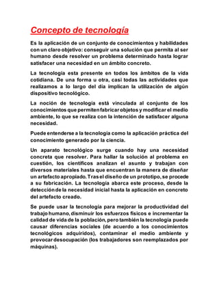 La tecnología se define como la aplicación de conocimientos y habilidades para resolver problemas y satisfacer necesidades humanas. Casi todas las actividades diarias implican el uso de dispositivos tecnológicos. La tecnología surge para satisfacer necesidades y puede usarse para mejorar la vida o causar daños dependiendo de cómo se aplique.