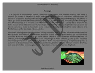 El documento habla sobre el concepto de tecnología. Explica que la tecnología se refiere a los conocimientos que permiten crear bienes y servicios para satisfacer las necesidades humanas y adaptarse al medio ambiente. También describe las funciones de las tecnologías a través de la historia, los métodos tecnológicos, y las relaciones entre la tecnología, la ciencia, el diseño y la informática.