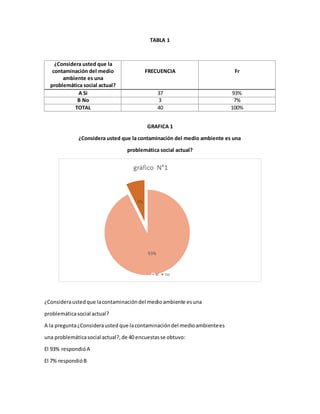 Este documento presenta los resultados de 5 encuestas realizadas a 40 personas sobre temas relacionados con la contaminación ambiental y su prevención. La mayoría de los encuestados considera que la contaminación ambiental es un problema actual y que no hay suficiente información para prevenir sus efectos. Todos apoyan las jornadas de limpieza en sus hogares y casi todos creen que dar buen manejo a los desechos contribuye a la preservación ambiental. La mayoría también concibe el enfoque de ciencia, tecnología y sociedad como la opción B planteada