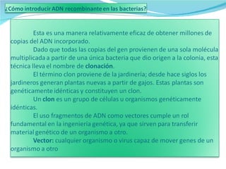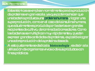 La tecnología de ADN recombinante permite unir fragmentos de ADN de diferentes organismos y hacer que un organismo produzca proteínas ajenas. Esto se logra aislando un gen y insertándolo en otro organismo usando enzimas de restricción, plásmidos y bacterias. Las técnicas de ADN recombinante permiten producir proteínas como la insulina humana a gran escala.