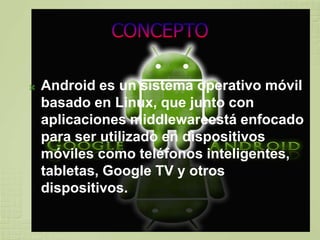 Android es un sistema operativo móvil basado en Linux que incluye aplicaciones como navegador web, correo electrónico, calendario y mapas. Corre aplicaciones Java en una máquina virtual Dalvik optimizada para dispositivos móviles. Soporta funciones como cámara, GPS, Bluetooth y conectividad celular. Los desarrolladores pueden crear nuevas aplicaciones que se distribuyen a través de Google Play.