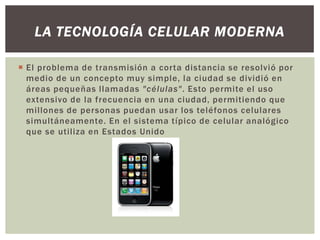 El documento describe la historia y el desarrollo de la tecnología celular. Explica que en la década de 1970, Martin Cooper introdujo el primer teléfono celular y que en 1979 aparecieron los primeros sistemas comerciales en Japón. Luego describe las primeras generaciones de tecnología celular, incluida la 1G analógica de 1979 y la 2G digital que llegó en 1990 y sigue siendo utilizada hoy en día.