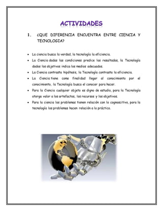 El documento contrasta la ciencia y la tecnología, señalando que la ciencia busca la verdad a través del método científico, mientras que la tecnología busca la eficiencia para lograr objetivos prácticos. También distingue entre conocimiento científico y tecnológico, indicando que el conocimiento científico se basa en el método científico para explicar fenómenos, mientras que el conocimiento tecnológico se define por su aplicación en actividades específicas. Finalmente, define artefact