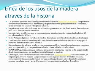 La madera ha sido uno de los primeros materiales utilizados por el hombre, usada para construir refugios, herramientas de caza y utensilios. A lo largo de la historia, la madera se ha usado ampliamente en la construcción de palacios, templos y casas. En la actualidad, aunque existen nuevos materiales, la madera sigue siendo apreciada en pisos y muebles debido a su belleza y durabilidad.