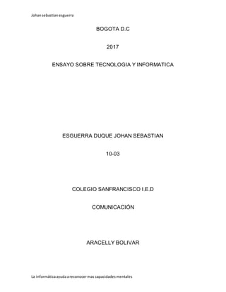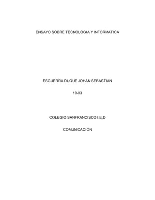 El documento es un ensayo escrito por Johan Sebastian Esquerra Duque para su clase de comunicación en el Colegio San Francisco I.E.D. El ensayo discute cómo la tecnología y la informática juegan un papel importante en la vida diaria al proveer herramientas para recolectar información y completar trabajos, aunque también pueden ser usadas de manera negativa si no se utilizan correctamente. La informática está presente en todas partes en la sociedad y existe en diferentes formas como la conexión a internet, teléfonos móviles