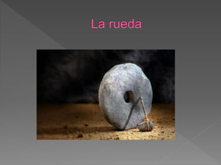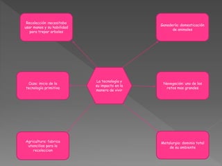 El documento describe la evolución tecnológica del hombre primitivo y sus principales hitos. El hombre primitivo satisfacía inicialmente sus necesidades alimenticias mediante la recolección de frutos y vegetales con sus manos. Luego, desarrolló su ingenio para cazar mediante el afilado de piedras y huesos. Más adelante, fabricó utensilios para almacenar alimentos recolectados y domesticó animales para facilitar su trabajo. Uno de los mayores retos fue la navegación para trasladarse a otros lugares