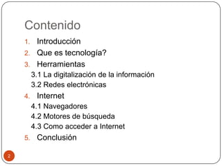 Este documento resume las principales tecnologías de información y comunicación como la digitalización de la información, las redes electrónicas y Internet. Explica qué es la tecnología y define conceptos clave como datos e información. También describe herramientas como navegadores, motores de búsqueda y cómo acceder a Internet. El documento concluye que las tecnologías permiten procesar y compartir información de forma global.