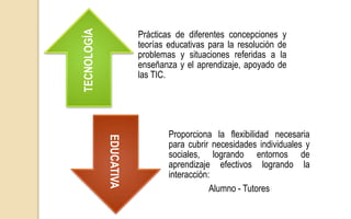 La tecnología educativa proporciona flexibilidad para satisfacer las necesidades individuales y sociales creando entornos de aprendizaje efectivos mediante la interacción entre alumnos, tutores y tecnología. El papel del maestro cambia a ser un guía que desarrolla recursos y herramientas de aprendizaje, mientras que la figura del tutor se une con el alumno para compartir conocimientos y experiencias. El uso de la tecnología requiere que los maestros se mantengan actualizados y asuman un nuevo rol de facilit