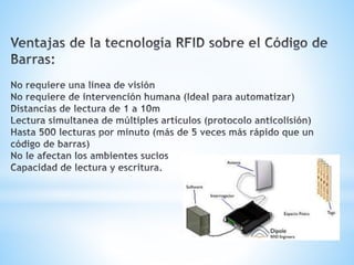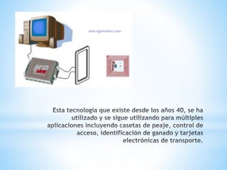 La tecnología RFID permite la identificación remota e inalámbrica de objetos mediante la comunicación entre etiquetas y lectores a través de ondas de radio, lo que puede aplicarse al seguimiento de productos en cadenas de suministro.