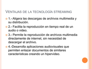 La tecnología streaming tiene ventajas como aliviar las descargas de archivos multimedia y facilitar la reproducción en tiempo real, pero también tiene desventajas como la falta de un estándar consolidado en archivos y la necesidad de un ancho de banda superior. La conclusión personal es que la tecnología streaming puede ser útil pero a veces impide la interacción física con otras personas.