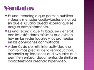 Este documento describe las ventajas y desventajas de la tecnología de transmisión. Las ventajas incluyen permitir la publicación de videos y audio sin necesidad de descarga completa, funcionar con estándares mínimos de red y permitir la interactividad y control preciso de la reproducción. Las desventajas son la falta de un estándar consolidado, la necesidad de un ancho de banda superior a 28.8 Kbps y disponer de software de servidor y cliente para obtener buena calidad.