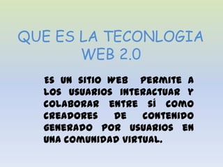 Este documento define y describe características clave de la tecnología Web 2.0, blogs y wikis. La tecnología Web 2.0 permite a los usuarios interactuar y colaborar como creadores de contenido en una comunidad virtual. Un blog es una publicación en línea con historias presentadas en orden cronológico inverso. Un wiki es un sitio web cuyas páginas pueden ser editadas por múltiples voluntarios a través del navegador web. La tecnología Web 2.0 ha reducido los costos de difus