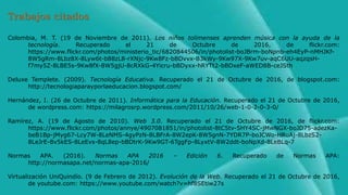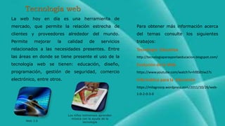 El documento describe cómo los niños en Tolima, Colombia están aprendiendo música con la ayuda de la tecnología web 3.0. Explica que la web actual permite una relación estrecha entre clientes y proveedores alrededor del mundo y mejora la calidad de los servicios relacionados a las necesidades presentes, incluyendo áreas como la educación. Proporciona enlaces a recursos adicionales sobre tecnología educativa, la evolución de la web y la web 1.0, 2.0 y 3.0.