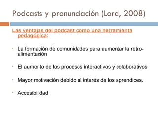 El documento describe varias tecnologías y herramientas para desarrollar las habilidades orales en un segundo idioma. Estas incluyen el uso de podcasts para mejorar la pronunciación, mensajes de voz para practicar gramática y vocabulario, entrevistas en línea para mejorar la articulación y dominio de conversaciones, conferencias audiográficas para superar desafíos como la falta de lenguaje corporal, y mundos virtuales para adquirir competencia pragmática a través de interacciones simuladas. Los estudios muestran algunos