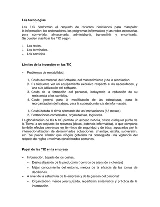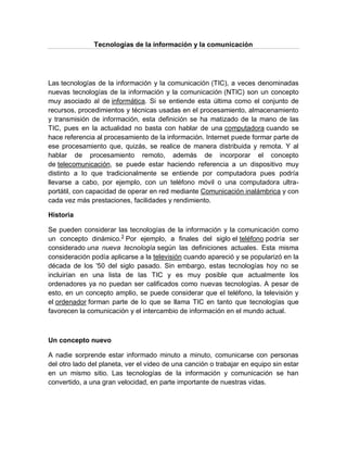 Las tecnologías de la información y la comunicación (TIC) se refieren al procesamiento, almacenamiento, transmisión y uso de información digital. El documento explica que las TIC ahora incluyen más que solo computadoras e Internet y pueden involucrar dispositivos móviles. También discute cómo las TIC se han convertido en una parte importante de la vida cotidiana y cómo afectan la opinión pública y las empresas.