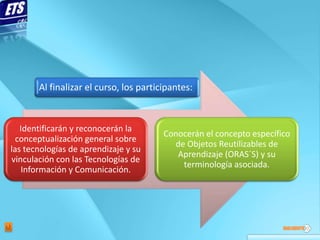 1) Los participantes identificarán conceptos generales sobre tecnologías de aprendizaje y su vinculación con TIC. 2) Conocerán el concepto específico de Objetos Reutilizables de Aprendizaje (ORAS) y su terminología asociada. 3) Aprenderán sobre la evolución de la educación a distancia y el uso creciente de Internet y plataformas virtuales.