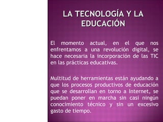 El documento habla sobre la Web 2.0 y su uso para la docencia. Explica que las herramientas de la Web 2.0 permiten desarrollar procesos educativos en Internet de forma sencilla y a bajo costo. Describe características como la utilidad, flexibilidad, colaboración y flujo de conocimiento que deben tener los escenarios educativos en la Web 2.0. Se mencionan herramientas como blogs, edublogs, wikis y se explican competencias digitales necesarias tanto para estudiantes como docentes.