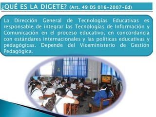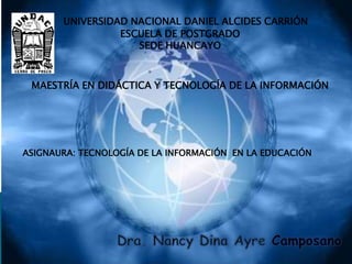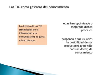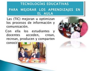Este documento presenta una revisión de los fundamentos teóricos de las tecnologías de la información y la comunicación (TIC) en la educación desde las perspectivas conductista, constructivista y conectivista. También describe las implicaciones de las TIC en los entornos de estudiantes y profesores, los beneficios de las TIC en la educación, y el proyecto Huascarán del gobierno peruano para implementar las TIC en las escuelas.