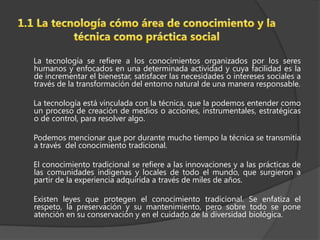 La tecnología se refiere a los conocimientos organizados por los humanos para mejorar el bienestar y satisfacer necesidades a través de la transformación responsable del entorno natural. La tecnología está vinculada a la técnica, que es el proceso de crear métodos e instrumentos para resolver problemas. Durante mucho tiempo, la técnica se transmitió a través del conocimiento tradicional de las comunidades indígenas, el cual existe leyes para proteger debido a su importancia cultural y biológica.
