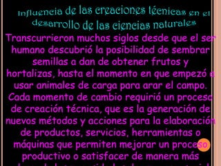 El documento habla sobre los inicios de los inventos y las creaciones técnicas a lo largo de la historia. Explica que las creaciones técnicas han ayudado a mejorar la calidad de vida de los seres humanos y a resolver problemas. También describe cómo las creaciones técnicas han influido en el desarrollo de las ciencias naturales a través de instrumentos como el telescopio y el microscopio, y cómo también han influido en las ciencias sociales desde el inicio de la civilización a través de expresiones gráficas.