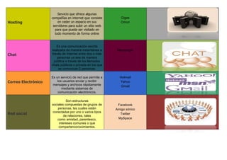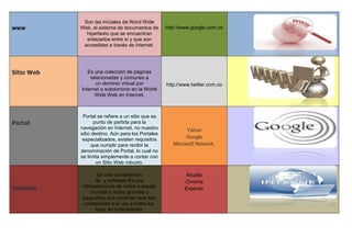 El documento define varios términos clave relacionados con Internet y la World Wide Web, incluyendo www, sitio web, portal, Internet, hosting, chat, correo electrónico, redes sociales, página web y nube. Explica que www se refiere a la World Wide Web, un sistema de documentos hipertextuales enlazados; un sitio web es una colección de páginas relacionadas bajo un dominio o subdominio; y un portal es un punto de partida para la navegación en Internet.